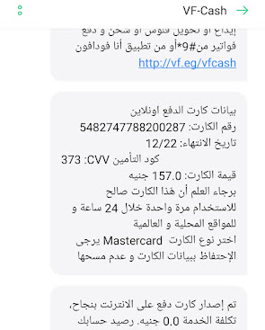 انشاء الفيزا عن طريق كود #100*9* بعد ذلك يمكنك استخدام المبلغ المراد وبيتم ارسال بينات الفيزا الي رسالة نصية من فودافون كاش .